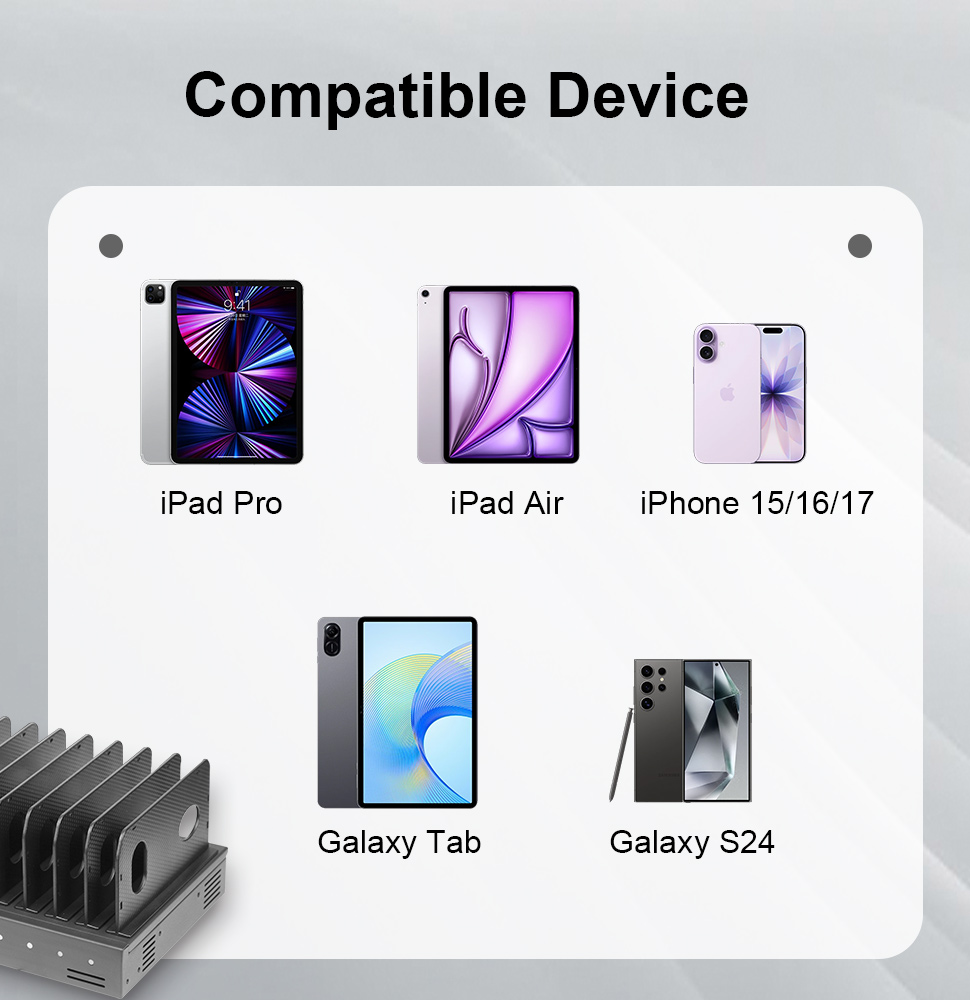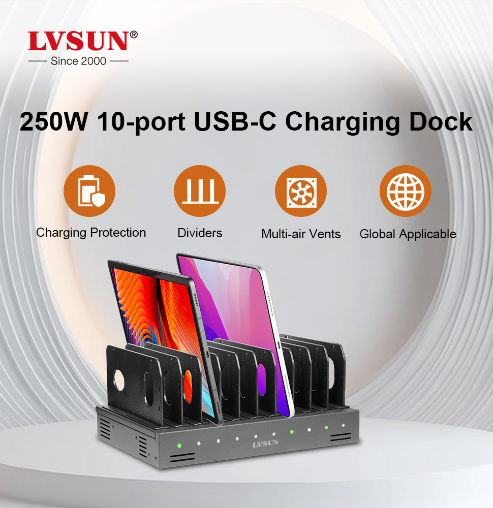 The versatile 10-ports USB-C Charging Dock is a universal solution for powering multiple devices from a single hub. This compact station delivers PD 3.0 up to 250W, ensuring fast and safe charging for smartphones, tablets, iPads, VR headsets, and school environments.